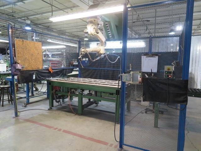 ROBOTIC WELDING SYSTEM, CONSISTING OF PEDESTAL GANTRY-MOUNTED, ROBOT, OTC MODEL AII-VGL, ROBOT CONTROL OTC AX21-UL0000, SN L21411YZ5007042, YEAR 2010, 5' X 9' WORKTABLE, LINCOLN 225 ARC WELDER, INFEED CONVEYOR, SCREENS. ASKING $15,000, MUST SELL