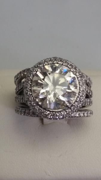DIAMOND RING, UNSTAMPED PLATINUM RING, CONTAINS ONE (1) PRONG SET ROUND BRILLIANT CUT DIAMOND MEASURING 11.4 X 7MM SI2 IN CLARITY AND J-K IN COLOR WEIGHING 5.64CT. ALSO CONTAINS TWO HUNDRED AND THIRTY-FOUR (234) PRONG SET ROUND BRILLIANT CUT DIAMONDS WEIGHING APPROXIMATELY 4.17 CTTW. THE RING WEIGHS 9.9 DWT AND MEASURES 16.5MM AT THE TOP AND 9MM AT THE BASE OF THE SHANK