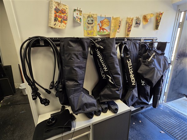 GROUP OF COMPRESSION SLEEVES, NORMATEC, HYPERICE, VARIOUS SIZES, (14) LEG SLEEVES, (2) ARM SLEEVES, (2) HIP SLEEVES, W/ CORDS