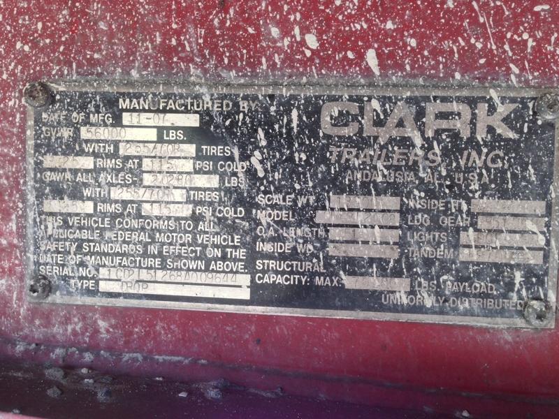 2008 CLARK MODEL CDFRT2008 53′ DROP-DECK TRAILER, MAX PAYLOAD 70,000 LBS., VIN# 1CD2L51294AOO8207. W/TANDEM AXLE, STORAGE BOX, TIE-DOWN STRAPS, WOOD DECK & RAMPS. TIRES VERY GOOD.